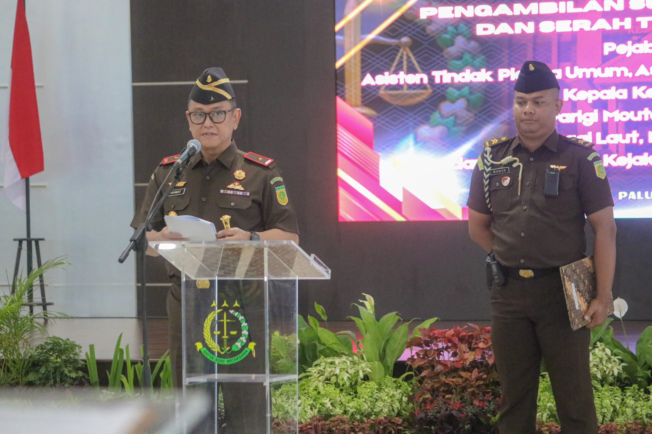 PALU – Kepala Kejaksaan Tinggi (Kajati) Sulawesi Tengah, N. Rahmat R, SH, MH, memimpin langsung upacara pelantikan, pengambilan sumpah jabatan, dan serah terima jabatan terhadap sejumlah pejabat eselon III, Para Kepala Kejaksaan Negeri serta Koordinator pada Kejaksaan Tinggi Sulawesi Tengah, berlangsung di Aula Kulawi lantai 6 Kantor Kejati Sulteng, hari selasa, 22 Juli 2025..