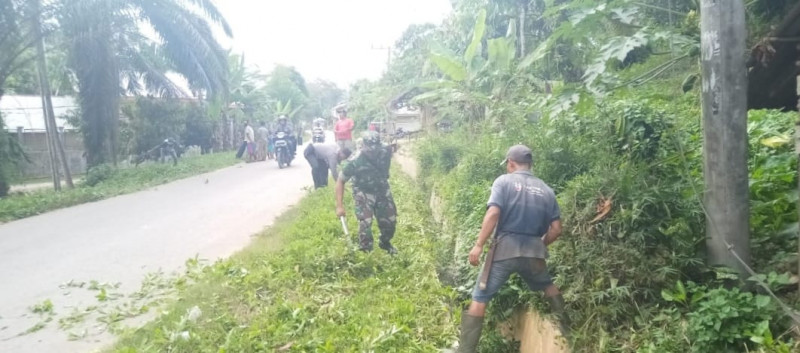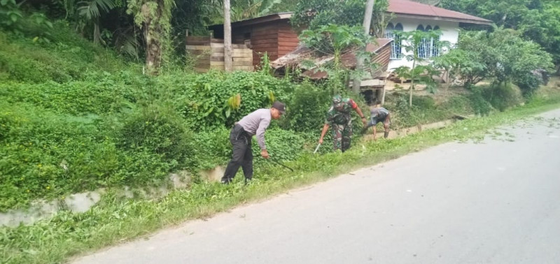 ACEH TIMUR – Babinsa Koramil 11/Brb Kodim 0104/Aceh Timur, Sertu Eko P bersama Bhabinkamtibmas dan warga melakukan gotong royong membersihkan rumput yang sudah panjang di badan kiri jalan, Bertempat di Desa Paya Bili Sa, Kecamatan Birem Bayeun, Kabupaten Aceh Timur, Sabtu (14/10/2023).