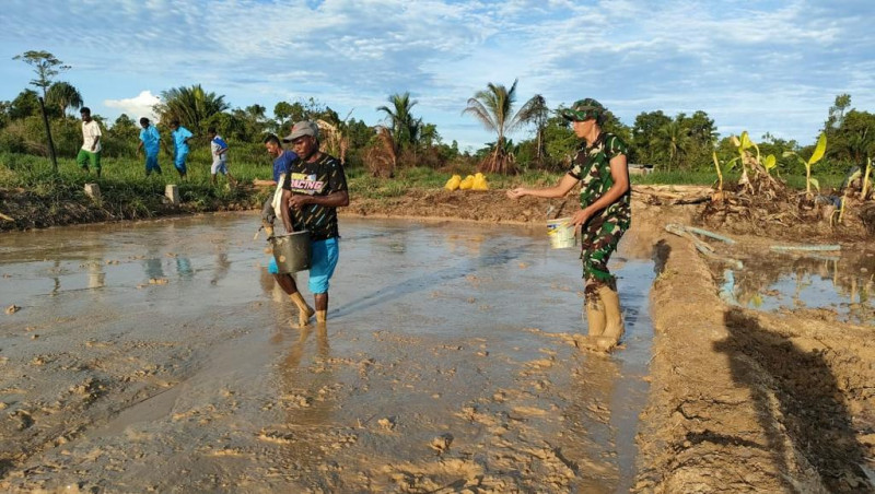 MAPPI – Sebagai Bentuk Kepedulian dan Dukungan Dalam Menjaga Ketahanan Pangan, di Wilayah Penugasan, Satgas Pamtas Kewilayahan Yonif 125/SI’MBISA Bersama Dinas Pertanian Kab. Mappi Perdana membuka Lahan Sawah Untuk Masyarakat, Bertempat di Kampung Mur, Distrik Nambai, Kabupaten Mappi.