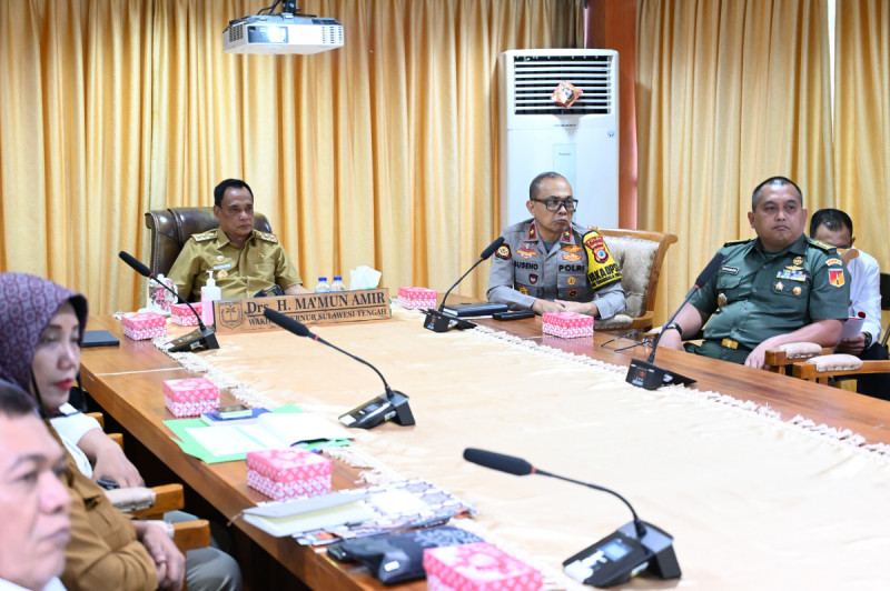 PALU – Wakil Gubernur Sulawesi Tengah Ma’mun Amir, bersama jajaran Forkompimda Sulteng beserta Tim Pengendalian Inflasi Daerah (TPID) mengikuti Rapat Koordinasi (Rakor) mingguan bersama Kementerian Dalam Negeri (Kemendagri) Republik Indonesia melalui zoom di Ruang Kerja Wakil Gubernur, Senin (26/02/2024).