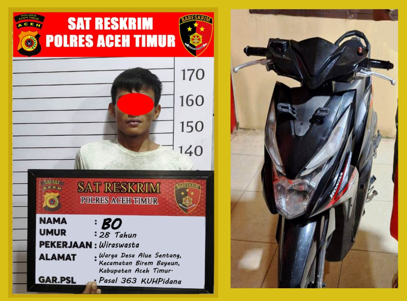 Kasatreskrim Polres Aceh Timur Iptu Muhammad Rizal, S.E.,S.H.,M.H., mengatakan pelaku ditangkap karena melakukan pencurian satu unit sepeda motor Honda Beat Nomor Polisi BL 6167 DAP, milik Syamsidar, warga Desa Leuge, Kecamatan Pereulak pada hari Senin, (01/04/2024) di kantor/gudang Jasa Exspedisi (J&T) yang terletak Desa Lhok Dalam, Kecamatan Peureulak, Kabupaten Aceh Timur.