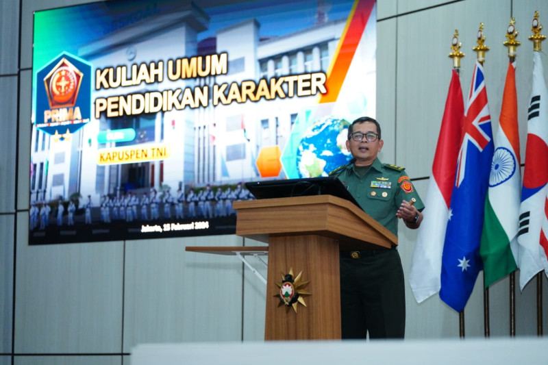 JAKARTA – Pendidikan karakter adalah bentuk penyempurnaan diri tiap individu secara konsisten dan melatih kemampuan diri untuk menentukan kemajuan generasi bangsa dimasa yang akan datang. Hal tersebut disampaikan oleh Kapuspen TNI Mayjen TNI Dr. Nugraha Gumilar, M.Sc., ketika memberikan kuliah umum dihadapan 183 Siswa Dikreg Seskoal Angkatan 62, bertempat di Aula Samadikun Seskoal, Jakarta Selatan, Kamis (15/2/2024).