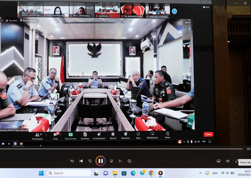 JAKARTA – Staf Kebijakan Strategis dan Perencanaan Umum TNI (Srenum TNI) menggelar Rapat Evaluasi Implementasi AKIP TNI TA. 2022. Rapat dipimpin oleh Kepala Pusat Reformasi Birokrasi (Kapus RB) TNI, Marsma TNI Marsudiranto W., M.Tr.(Han) yang mewakili Asrenum Panglima TNI, Laksda TNI Hery Puranto, S.E., M.M., dan dilaksanakan secara Hybrid (daring & luring) dengan melibatkan setiap perwakilan Satuan Kerja dari Unit Organisasi Mabes TNI, TNI AD, TNI AL dan TNI AU, di ruang rapat Srenum, Mabes TNI, Cilangkap, Jaktim, Kamis (19/10/2023).