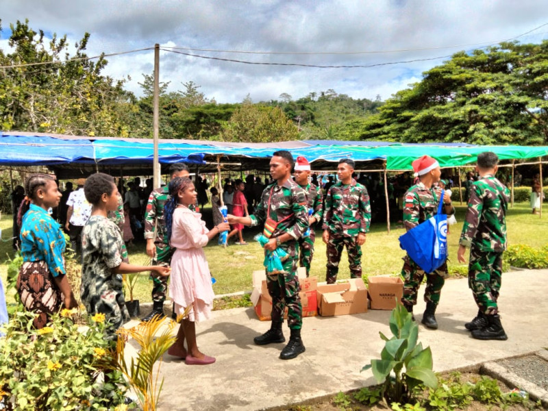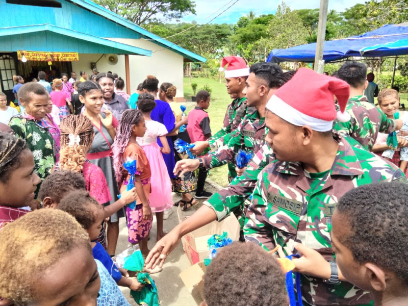 Kegiatan tersebut dalam rangka menyambut Natal dan Tahun Baru anggota satgas pamtas statis RI-PNG Yonif 122/TS yang bertugas di wilayah jajaran Kolakops Korem 172/PWY melaksanakan kegiatan berbagi kebahagiaan dalam suasana natal untuk anak-anak pedalaman Perbatasan Papua, Senin (25/12/2023).