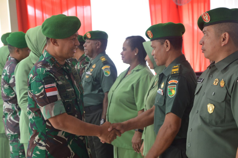Usai kegiatan selesai, Danrem 174/ATW beserta ibu dan para Dansat memberikan ucapan selamat kepada seluruh prajurit yang naik pangkat serta melaksanakan foto bersama. (*)