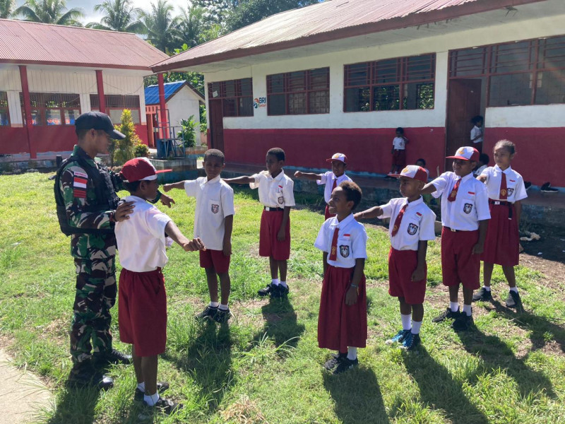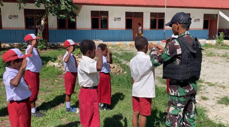 DISTRIK MUARATAMI – Satuan tugas pengamanan Perbatasan RI-PNG Batalyon Infanteri 122/TS yang berada dibawah komando kolakops korem 172/PWY ikut serta berikan pengetahuan tentang baris – berbaris di Sekolah Dasar Negeri Mosso yang berada di Kp. Mosso, Distrik muaratami, Kota Jayapura, Selasa(05/03/2024).