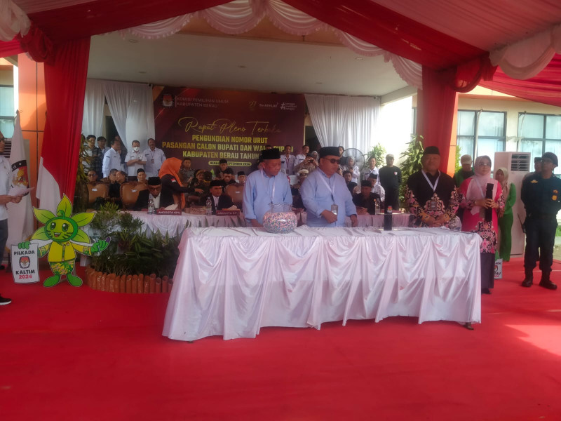 BERAU – Komisi Pemilihan umum (KPU) Berau menetapkan dua nomor urut untuk pasangan Calon (paslon) Bupati dan Wakil Bupati Berau untuk Pilkada 2024. Penetapan itu dilakukan dalam rapat pleno terbuka KPU di halaman kantor KPU jalan H Isa I,Tanjung Redeb (23/9/2024). Pasangan Madri Pani – Agus Wahyudi (MP-AW) mendapatkan no urut 1 dan petahana Sri Juniarsih- Gamalis (SRAGAM) mendapatkan nomor urut 2.